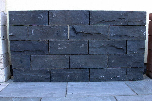 - Beschreibung: Vorderansicht gespalten, Lagerfugen + Köpfe gesägt und zurückgeschlagen, palettiert, 16,5 Stück / qm