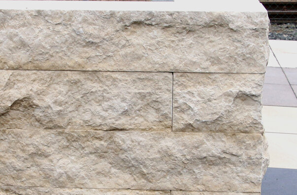 1 Sichtseite gespalten, 2 Sichtseite gespalten und mit gesägter Fläche 20x30cm zum bündigen Anschluss an Magnus-Quader, Lagerfugen und 1 Kopf gesägt, palettiert - Artikelnummer: 13850115
