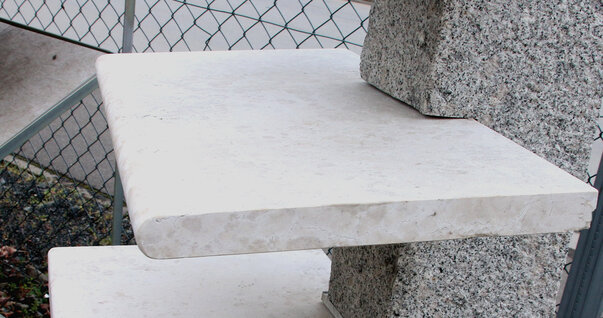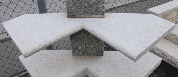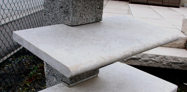 - Beschreibung: Innenkante mit R=1,5 cm, Oberseite sandgestrahlt+gebürstet, Innenkante geschliffen, Rest gesägt